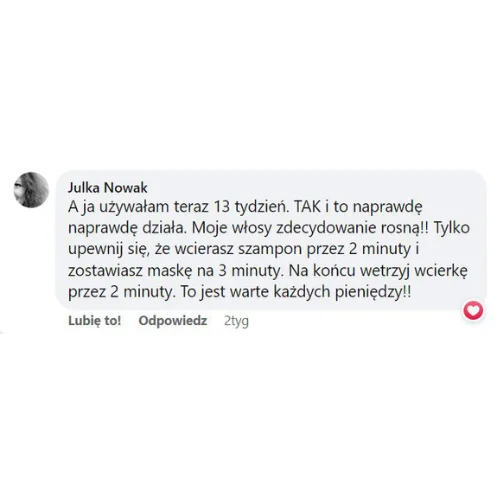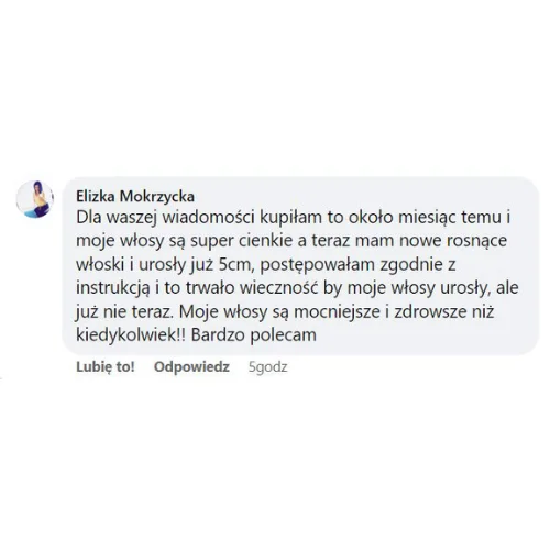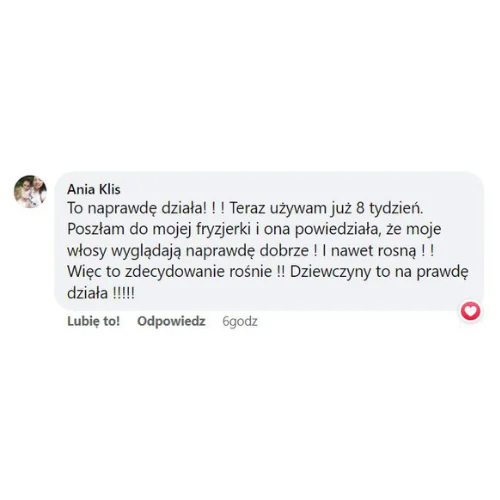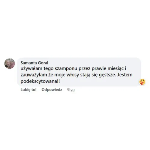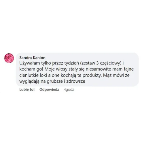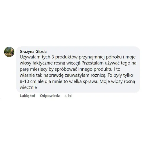 Witam ponownie dziś poraz pierwszy umyłam głowę produktami i muszę powiedzieć, że jestem pozytywnie zaskoczona po umyciu według wskazówek skóra głowy jest nawilżona i włosy również a suszyłam włosy suszarką nie czuje skóry głowy jak do tej pory po innych szamponach napiętej i suchej jeszcze dziś włosy też mi wychodziły ale na te efekty nie wypadania włosów i ich odrost muszę zaczekać jeśli się sprawdzi to bardzo chętnie zamówię kolejny zestaw i zostanę przy tych produktach.