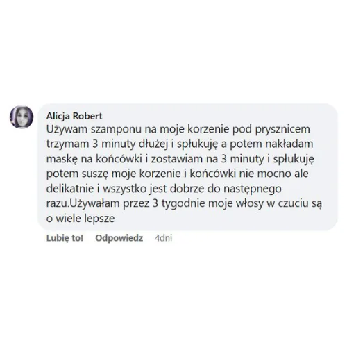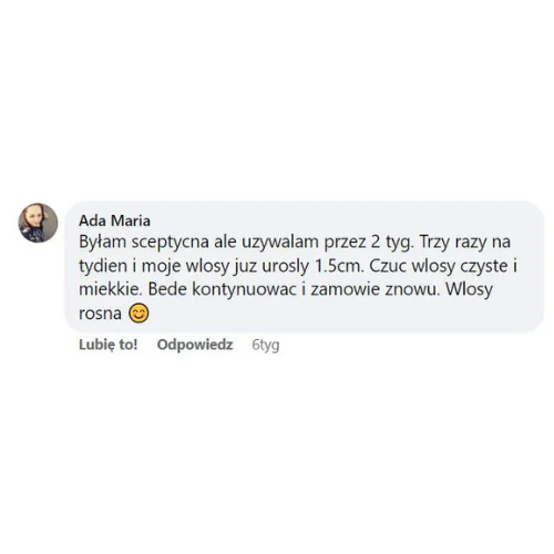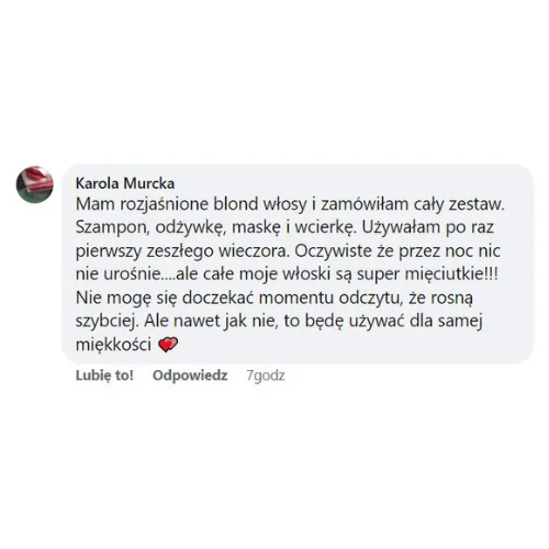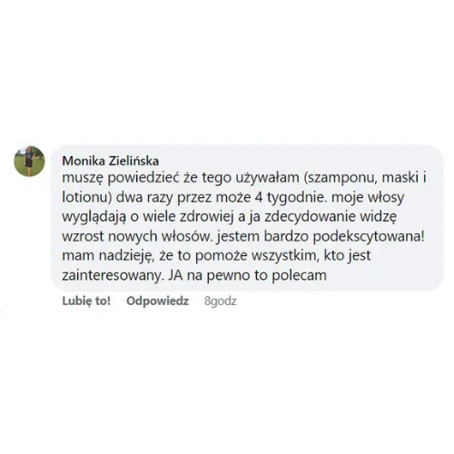 Witam ponownie dziś poraz pierwszy umyłam głowę produktami i muszę powiedzieć, że jestem pozytywnie zaskoczona po umyciu według wskazówek skóra głowy jest nawilżona i włosy również a suszyłam włosy suszarką nie czuje skóry głowy jak do tej pory po innych szamponach napiętej i suchej jeszcze dziś włosy też mi wychodziły ale na te efekty nie wypadania włosów i ich odrost muszę zaczekać jeśli się sprawdzi to bardzo chętnie zamówię kolejny zestaw i zostanę przy tych produktach.